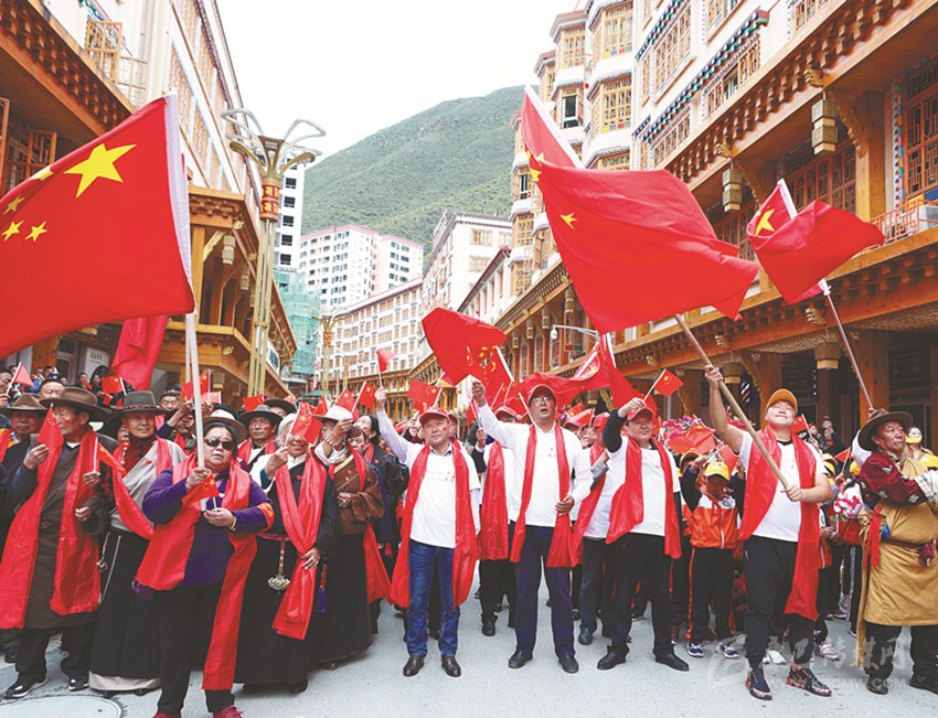 伴隨著悠揚的旋律,在當(dāng)?shù)馗袼_爾藝術(shù)團演員的帶領(lǐng)和感染下,幾千名當(dāng)?shù)馗刹咳罕娚碇A服,揮舞著手中的五星紅旗,懷著無比激動的心情獻歌祖國,同唱《我和我的祖國》。深情激昂的歌聲感染到在場的每一個人,有的高呼喝彩、有的熱淚盈眶,齊聚在鮮紅的國旗下,齊聲高喊:“我愛祖國,祖國萬歲!”