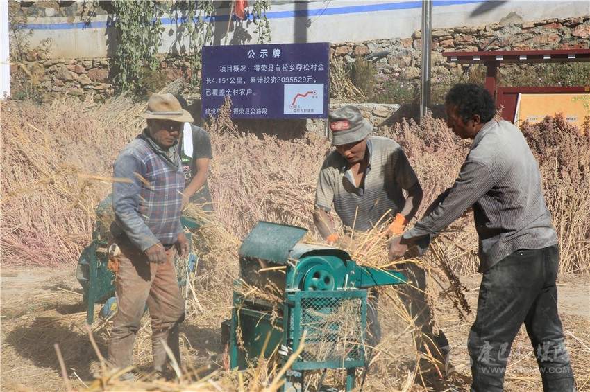 金秋的陽光熾熱溫暖,得榮縣白松鎮(zhèn)奪松村一片祥和安寧。11月10日,村民們正在村活動室的院壩里脫粒藜麥,豐收的喜悅寫在忙碌的村民的臉上?!按蠹壹佑透桑艳见溄唤o公司,立馬可以拿到現(xiàn)錢?!眾Z松村委會副主任四郎都遷高興地說,盤點收成,今年又是一個豐收年。
