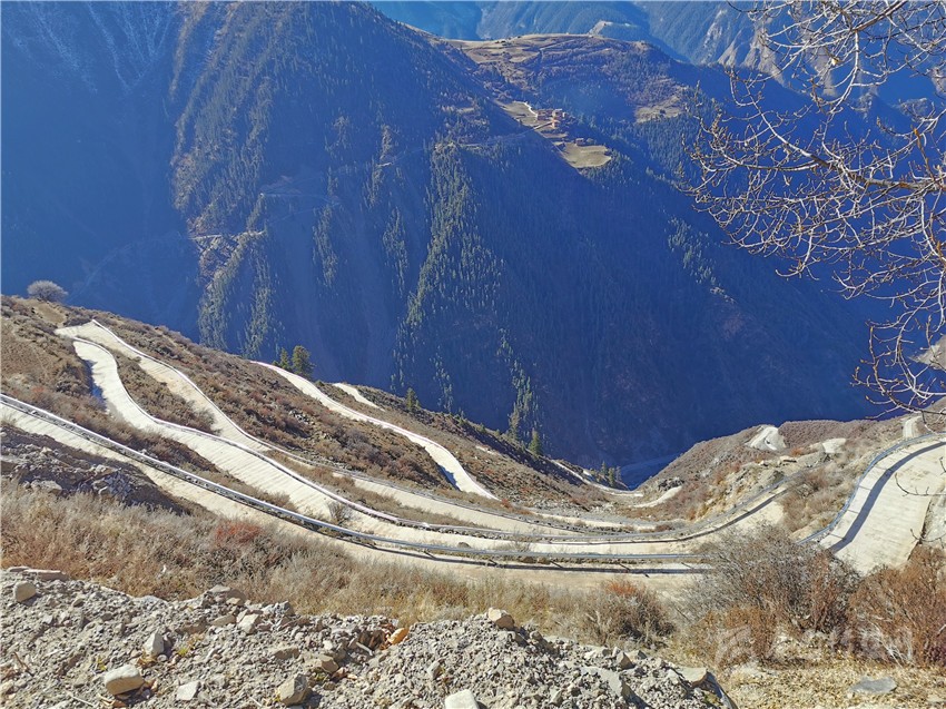然布村山頂,住著包括白馬青珠和嘠絨多吉家在內的14戶藏族老鄉(xiāng)。以前,從海拔3000米的山腳,到海拔4000米的山頂家里,只有一條一米左右寬的羊腸小道。下山一個來回,路上就要花一整天。山高路險、交通不便,許多村民一年都難得下山一趟。遇上需要修房運送木材等,靠著人拉馬馱,來來回回,光運輸就要耽擱大半個月時間。
