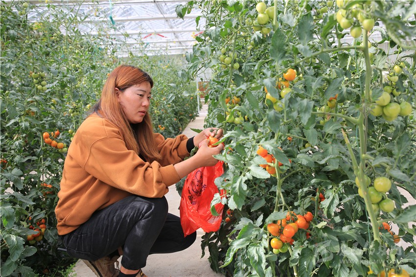 記者來到產(chǎn)業(yè)園的智能溫室大棚,只見里面各種紅的黃的綠的、大的小的番茄,掛滿藤蔓?!盎匾苑N植綠色無公害農(nóng)產(chǎn)品為主,這是我們今年開始試種的小番茄,有十來個品種,你別看它還是綠色的,其實已經(jīng)成熟了。”記者接過孟凡強摘下的幾個小番茄,一口咬下,香甜多汁且沁人心脾。孟凡強介紹,這是他們與北京神州綠鵬農(nóng)業(yè)科技有限公司合作,精選引進中國航天工程育種的優(yōu)質(zhì)品種。除了番茄,溫室內(nèi)還種有秋葵、辣椒、小葫蘆、僧帽瓜等蔬菜,處處綠意盎然。