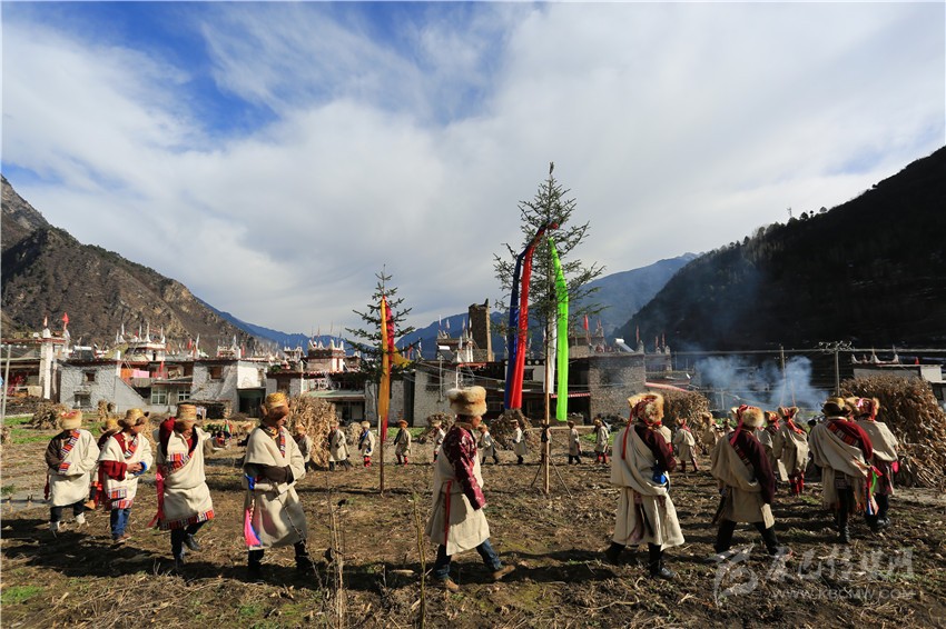據(jù)了解,過去,無論是土司官寨還是尋常百姓家,此儀式均在鍋莊房內(nèi)進行,如今仍是如此。當(dāng)?shù)厝嗽诠?jié)日期間有吃“寬廷”“嘎”“朵拉”及酸菜面條的習(xí)俗,還會在房屋外墻涂抹礦物質(zhì)白灰,于其上繪制各種吉祥圖案,整個節(jié)日充滿了農(nóng)耕文化色彩以及嘉絨族源中古羌系人群的時間觀念印跡。