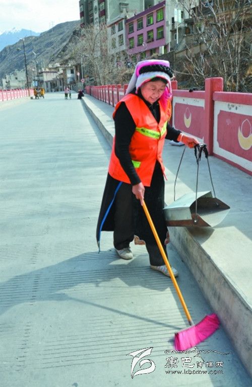 由于丹巴縣城素有風(fēng)城之稱,五條山谷的風(fēng)仿佛都聚集在了志瑪大姐負(fù)責(zé)的濱河路上,風(fēng)的匯聚也成了垃圾的集中點(diǎn),當(dāng)時(shí)在分配工區(qū)時(shí),許多清潔工都唯恐這段路落在自己頭上,可志瑪大姐卻主動(dòng)承擔(dān)起這段路面的清潔任務(wù),每天其他清潔工人還在睡夢中時(shí),她就早早的起床,開始一天的工作。烈日當(dāng)空時(shí),別人都躲在家里乘涼時(shí),志瑪大姐還在路段上來回的巡視,時(shí)刻保持路面的清潔。冬日來臨寒風(fēng)呼嘯,城市里的人們都蜷縮在蝸居里開著空調(diào)、電暖氣等,享受著天倫之樂時(shí),志瑪大姐卻穿著厚厚的冬裝,戴著手套在濱河路上費(fèi)力的掃著地,她從來沒有叫過一聲苦,有人勸她放棄這段路,她總是笑著說:“國家給了我工資,我就要好好的干,再說城市如果沒有我們這些清潔工,那市民將會(huì)生活在臟亂差的環(huán)境里,將有損丹巴這座美麗小城鎮(zhèn)的形象。”