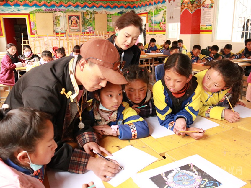 圖為嘎瑪嘎孜派唐卡傳承人教學(xué)生畫唐卡。