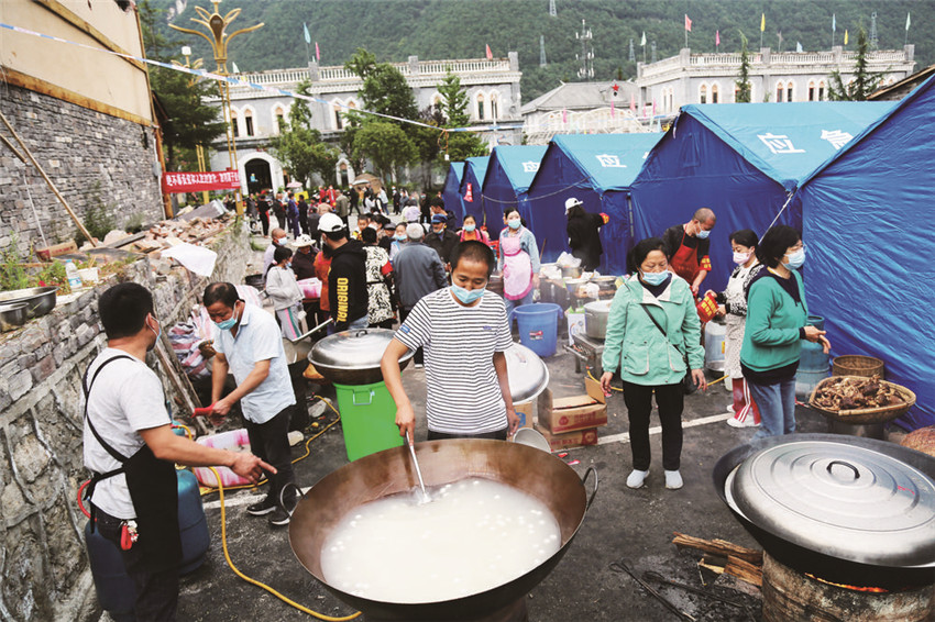 這是來之不易的“百家飯”,在“9·5”瀘定縣6.8級地震發(fā)生后,受災村民你拿一袋米、我提一筐菜,你出一份力、我捐一點錢,齊心協(xié)力、共渡難關,520人共煮一鍋“團結飯”。
