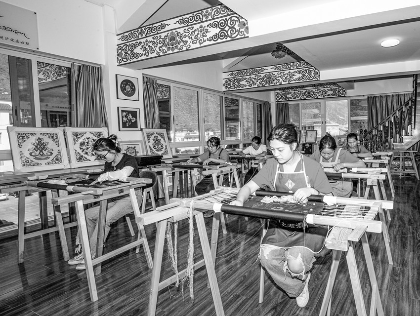 據(jù)烹壩鎮(zhèn)副鎮(zhèn)長王昇介紹,2018年在省州縣婦聯(lián)的大力支持和幫助下,烹壩鎮(zhèn)成立了“指尖藏花貴瓊刺繡”合作社,150余名婦女加入到合作社,參與刺繡。自從成立了合作社,村里的婦女們背著娃,繡著花,養(yǎng)活自己,養(yǎng)活全家?!爸讣獠鼗ㄙF瓊刺繡”合作社的“貴瓊藏繡”已成為烹壩鎮(zhèn)婦女增收的好項目。婦女們有事做了,干群關(guān)系也更加緊密,老百姓遇到問題也更加愿意找黨員、找干部。同時“貴瓊藏繡”這種康巴地區(qū)特有的非遺傳承技藝也得到了很好傳承和發(fā)揚。