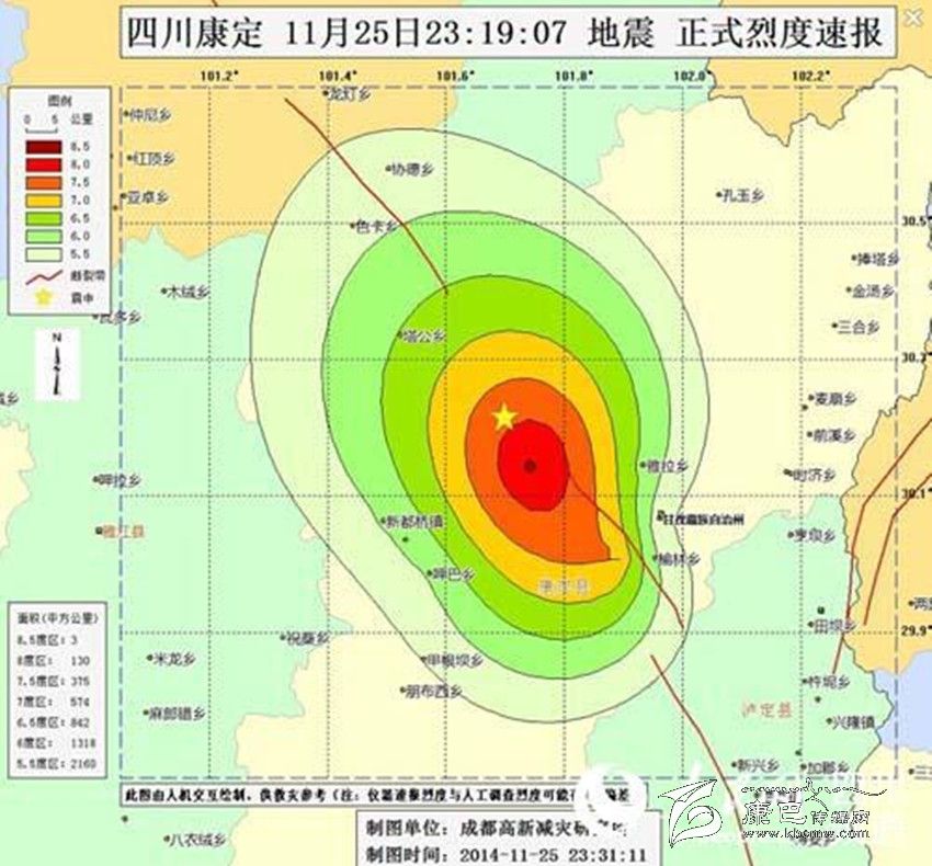 據(jù)人民網(wǎng)成都11月26日報道 記者剛剛從成都高新減災研究所了解到,11月25日23時19分在四川省甘孜藏族自治州康定縣(北緯30.2度,東經(jīng)101.7度)發(fā)生5.8級地震,此次地震系康定6.3級地震的余震。