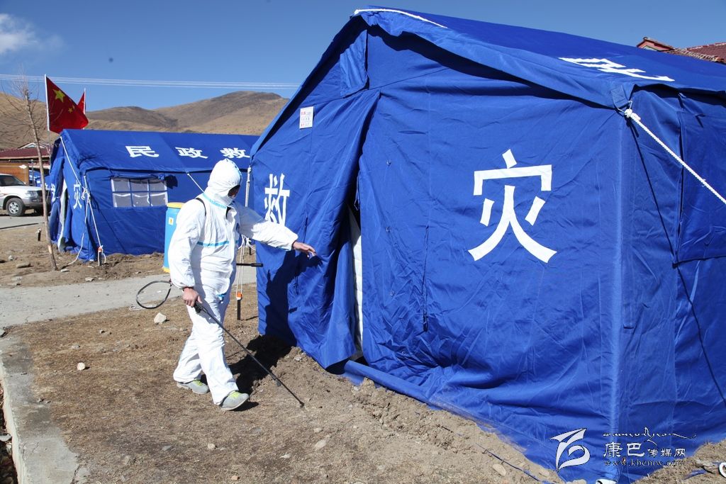 在離武警武警四川總隊(duì)二支隊(duì)的醫(yī)務(wù)站不遠(yuǎn)的地方,新都橋中心衛(wèi)生院的衛(wèi)生員羅衛(wèi)強(qiáng)正“全副武裝”的為每一頂帳篷做著消毒。羅衛(wèi)強(qiáng)說:“我們從地震第一天到現(xiàn)在一直堅(jiān)守在一線,22日到26日都在祖慶小學(xué)進(jìn)行消毒工作,27日和其他工作人員換班到了江巴牧民新村安置點(diǎn)。我們每天會(huì)早上一次,晚上一次對(duì)每一間帳篷進(jìn)行兩次消毒。除了我們,康定縣疾控中心的工作人員還會(huì)每天進(jìn)行一次消毒,我們都在盡最大的努力保證牧民生活環(huán)境的衛(wèi)生。”在對(duì)環(huán)境進(jìn)行消毒后,他又來(lái)到醫(yī)療就助點(diǎn)為前來(lái)就醫(yī)的甲瑪它看起病來(lái)。
