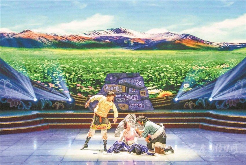 在團(tuán)拜會節(jié)目演出環(huán)節(jié),隨著主持人一句“柳綠枝頭待燕歸,金雞賀歲開門紅”脫口而出,20余名活潑、歡快的少年涌上舞臺,就著音樂的節(jié)拍,揮手踏足、左挪右轉(zhuǎn),翩翩起舞;少年們舞動的長袖映著縷縷斑斕的光束,依如雄鷹在拍打著飛翔的翅膀。這便是此次演出的開場節(jié)目《雛鷹飛翔》,一場絢麗多彩的“甘孜春晚”由此火熱開演。隨后,一群體態(tài)輕盈、妝如仙鶴的女子用靈動的舞姿為甘孜祈福,點明了此次團(tuán)拜會的一大主旨——祝福甘孜。