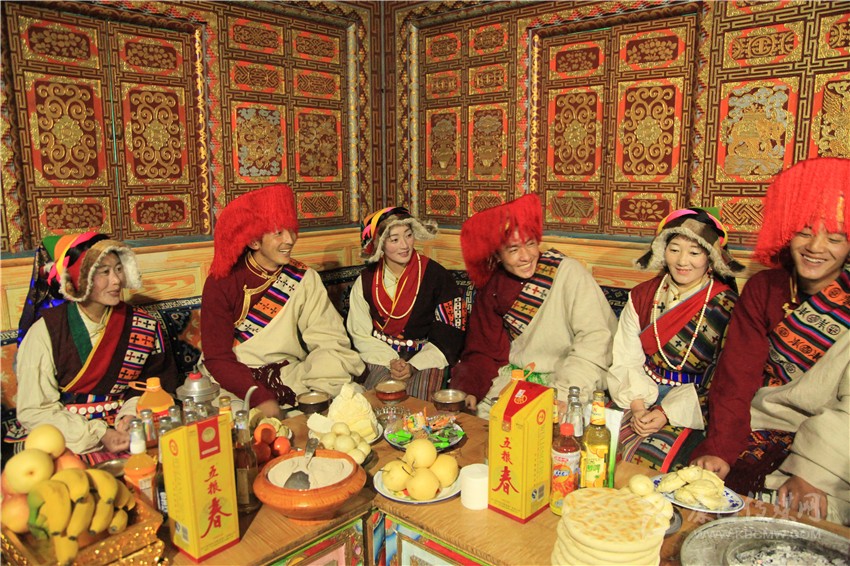 一家人穿上節(jié)日盛裝,按輩序就座。主婦手捧吉祥斗恭恭敬敬地走到長輩跟前說“扎西德勒”,對方抓幾粒麥子邊向上撒邊祝福說:“扎西德勒!美滿幸福,祝主婦身體健康,預(yù)祝明年大家仍如此團聚歡慶?!痹僮ヒ稽c切瑪送進嘴里。家庭儀式后,家中兩人一個拿青稞酒、銀酒碗,一個手捧切瑪,到左鄰右舍、親朋好友家拜年,敬獻切瑪、青稞酒,互相祝福。