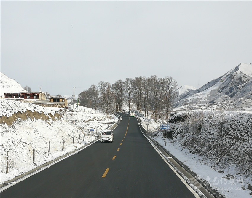 安全通過折多山后,天已完全放亮,只見道路兩邊的山丘、草地和樹木全被積雪覆蓋,與之形成鮮明對比的是一條寬闊平整的黑色柏油路,整個畫面就像一幅水墨畫,而我們這車人就行進在“畫中”。