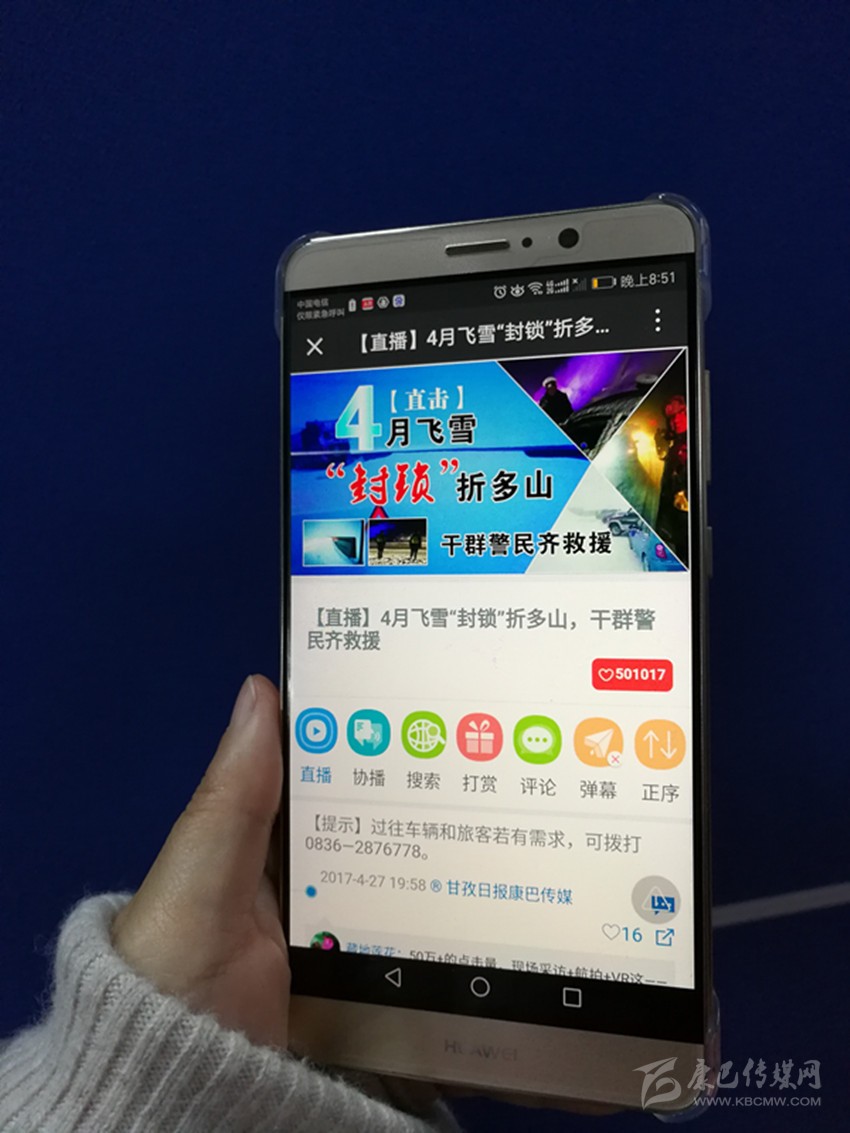 一路上,記者通過甘孜日報微信平臺,將救援情況和群眾的實況,第一時間進行了直播。隨著一條條現(xiàn)場圖片、文字和視頻的及時發(fā)布,人們第一時間得知了折多山受困車輛和群眾得到救助的實際情況,人們紛紛在直播平臺留言,為交通、路政和當?shù)攸h委、政府的救援行動點贊。在對折多山強降雪和受堵現(xiàn)場進行直播報道的同時,甘孜日報社還利用直播平臺,回顧了折多山道路交通難的歷史,并再次發(fā)布雅康高速修建、折多山隧道立項等重大交通建設工程的進展情況,又對此次折多山風雪阻斷道路交通,導致車輛和人群滯留的特殊原因進行了報道和澄清,并報道了風雪中仍有不少徒步游客繼續(xù)甘孜之旅的情況,第一時間讓更多的人了解到,飛雪并未對道路造成致命影響,甘孜州的道路交通狀況和應急處置能力已經得到了極大的提升,完全有能力保障人們出行以及生命、財產安全。