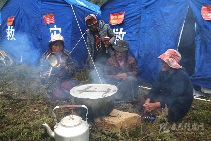 曲珍、曲西和幾個伙伴正在燒著開水。“這是到安置點后我第一次生火。前兩天吃干糧喝礦泉水,讓喝慣了酥油茶的我們很不適應(yīng)?!鼻湔f。