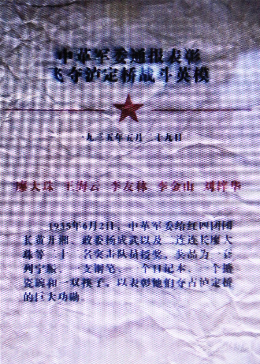 劉東升談起父親當(dāng)年作為飛奪瀘定橋22勇士之一,心情無比激動?!案赣H當(dāng)年如果不是努力爭取,就沒有后來的勇士稱號,更沒有中革軍委的嘉獎?!?935年5月,北上抗日的紅軍向天險大渡河挺進。大渡河水流湍急,兩岸都是高山峻嶺,只有一座鐵索橋可以通過。這座鐵索橋,就是紅軍北上必須奪取的瀘定橋。
