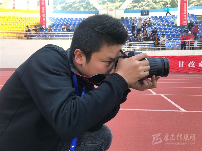 本網記者在州運會現場采訪。(照片由本網走轉改小分隊和李婭妮、劉小兵提供)