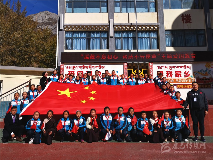 活動中,高原牧區(qū)的孩子親手觸摸到了這面長5米、高3.3米的五星紅旗,現(xiàn)場師生情緒高昂。