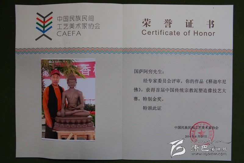 由中國民族民間工藝美術(shù)家協(xié)會主辦的“首屆中國宗教泥塑技藝大賽”,旨在傳承宗教泥塑造像技藝,搭建宗教造像藝術(shù)家展示平臺。本次大賽共有來自臺灣、香港、天津、河北、四川、西藏、云南、浙江、江蘇、貴州、江西、寧夏、江西等地的39名泥塑高手現(xiàn)場制作,角逐獎項(xiàng)。我州的國薩阿窮等三名藝人現(xiàn)場制作的泥塑作品《釋迦牟尼》榮獲特別金獎,同時(shí),國薩阿窮還榮獲了“中國傳統(tǒng)工藝美術(shù)大師(宗教雕塑)”榮譽(yù)證書。