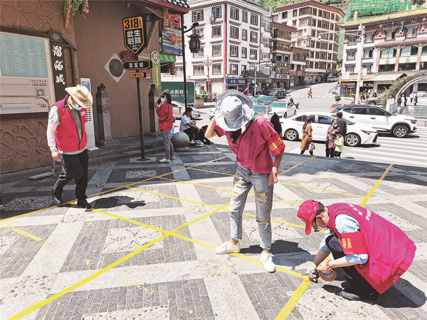 康定市志愿者正在粘貼核酸檢測(cè)排隊(duì)間隔線。