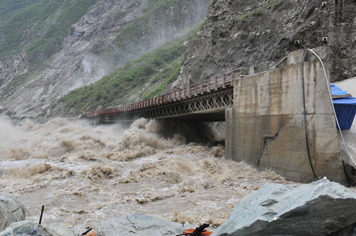 6月29日,恰逢周末,但在該公司的防汛指揮中心已是繁忙緊張氣氛,防汛值班員雖已熬紅了雙眼,緊盯著監(jiān)視屏并時(shí)刻保持與前方的聯(lián)系;7時(shí)23分,該公司副總經(jīng)理杜三林,長(zhǎng)河壩工程部、安全環(huán)保部相關(guān)負(fù)責(zé)人來到了指揮中心;8時(shí),流量逼近4170立方米每秒;10時(shí),流量超過4200立方米每秒,已超過該工程自2010年開工以來最大流量,整個(gè)指揮中心的氣氛變得隨之凝重起來;10時(shí)30分至11時(shí),指揮中心接連收到施工單位電話險(xiǎn)情報(bào)告:此時(shí)此刻,長(zhǎng)河壩工程初期導(dǎo)流洞水勢(shì)兇猛,導(dǎo)流洞出口橋0號(hào)橋臺(tái)回填料淘刷嚴(yán)重,1號(hào)橋墩發(fā)生傾斜,橋梁隨時(shí)有傾覆的可能,將會(huì)危及下游圍堰高程最低的中水十四局、中水五局營(yíng)地的安全,更將會(huì)危及到300余名員工的人身安全;金湯河突發(fā)特大洪水,沖垮了通往金湯土料場(chǎng)的場(chǎng)內(nèi)公路,沿線山體已發(fā)生了小型泥石流,土料場(chǎng)通訊、交通已全部中斷,急需救援;持續(xù)降雨引發(fā)響水溝泥石流,3萬余立方米泥石流堆積物順溝而下,沖垮了響水溝石料場(chǎng)的鋼橋,并堵塞了場(chǎng)內(nèi)12號(hào)路1號(hào)隧道。必須馬上清運(yùn)疏通,否則,響水溝再發(fā)泥石流,長(zhǎng)河壩上游圍堰和大壩填筑工作面將直接面臨泥石流堆積物的直接沖擊,險(xiǎn)情萬分緊急!