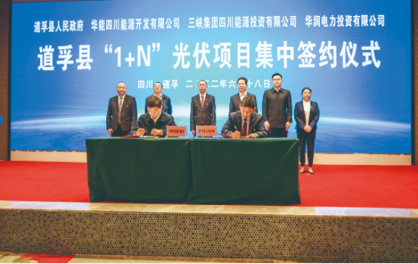 道孚縣“1+N”光伏項目位于道孚縣色卡鄉(xiāng)、龍燈鄉(xiāng)、木茹鄉(xiāng),計劃靜態(tài)總投資75億元,規(guī)劃總裝機容量150萬千瓦,包括亞日I標50萬千瓦、亞日II標50萬千瓦、龔呂50萬千瓦三個光伏項目。2022年6月18日,道孚縣人民政府與三峽集團四川能源投資有限公司在道孚縣舉行亞日Ⅱ標50萬千瓦光伏電站簽約儀式,標志著該縣向打造“千萬千瓦級清潔能源基地”邁出實質(zhì)性、關(guān)鍵性一步。