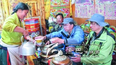 位于宗塔草原“大盆地”東邊山坡的降巴牧場(chǎng)在隊(duì)員們的心里也留下了深刻的印記。15日早上5點(diǎn)半隊(duì)員們就出發(fā)上了降巴牧場(chǎng)。朝霞映紅了天邊,紅云罩著青草牛糞味飄香的草坡。比采風(fēng)隊(duì)員們起得更早的牧人已擠完了牛奶,一個(gè)僅10 歲的女孩正在草坡上拾牛糞;牛毛帳篷里,勤勞的牧婦已打開了牛奶分離器開始分離酥油了……一問,方知牧民們今晨4點(diǎn)就起床勞作,干完早上的活兒,他們要趕到三公里遠(yuǎn)的“盆地”耍壩子,看賽馬。這個(gè)牧場(chǎng)靜謐潔凈得令人稱奇,青青的草坡上絕少有垃圾存留,沒見到一只兇惡的牧犬;按季節(jié)劃分的草場(chǎng)由整潔的網(wǎng)圍欄圈開,分隔有致;牧人舉家出門,連帳篷門也不掩,據(jù)說這里沒有偷盜發(fā)生,家人和諧;古老、平和的氣氛中,晨風(fēng)輕拂,野花青草搖曳,輕柔的晨霧中偶而傳來兩聲牛哞,讓人頓感心靜如水。對(duì)于長(zhǎng)期居住城市的人來說,這里無疑是“幽雅天堂”了。