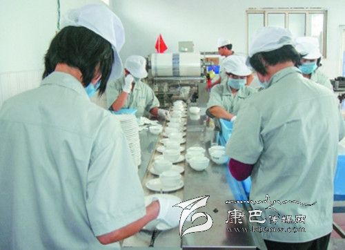 經(jīng)過(guò)消毒后,筷子會(huì)被最先單獨(dú)分出,獨(dú)立包裝,由專人負(fù)責(zé)。其余餐具被送到傳送帶上,由工人分工負(fù)責(zé)擺餐具,盤(pán)子在下,碗勺在上,按照包裝要求擺好。