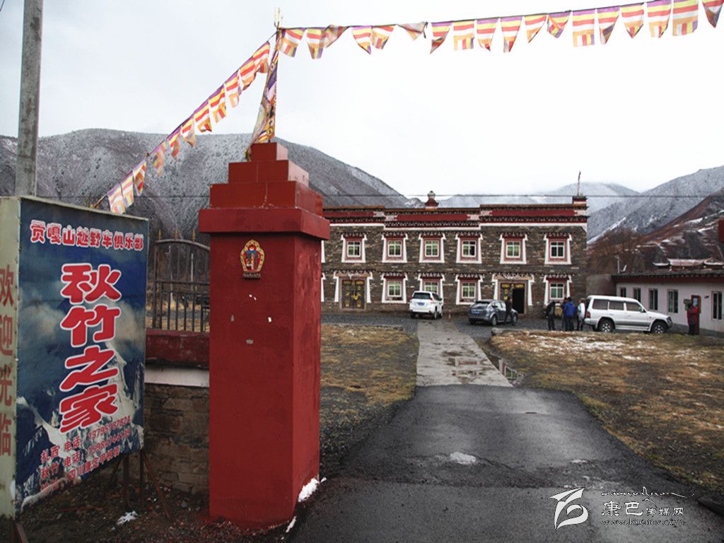 在距鄉(xiāng)政府不遠的營九路邊上,有一個“貢嘎山越野車俱樂部·秋竹之家”的燈箱廣告。在雪山的映襯下,這個不大的燈箱廣告顯得格外引人注目。步入“秋竹之家”的大門,進入眼簾的是一幢民族風(fēng)格濃郁的建筑,黑白紅三色相間的墻面,還沒有吐綠的院壩,所有的一切,都讓記者看不出這幢建筑與普通民居有什么不同的地方。