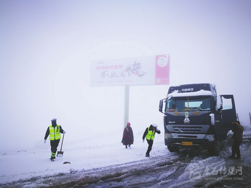 交警在折多山的風(fēng)雪中疏導(dǎo)交通。