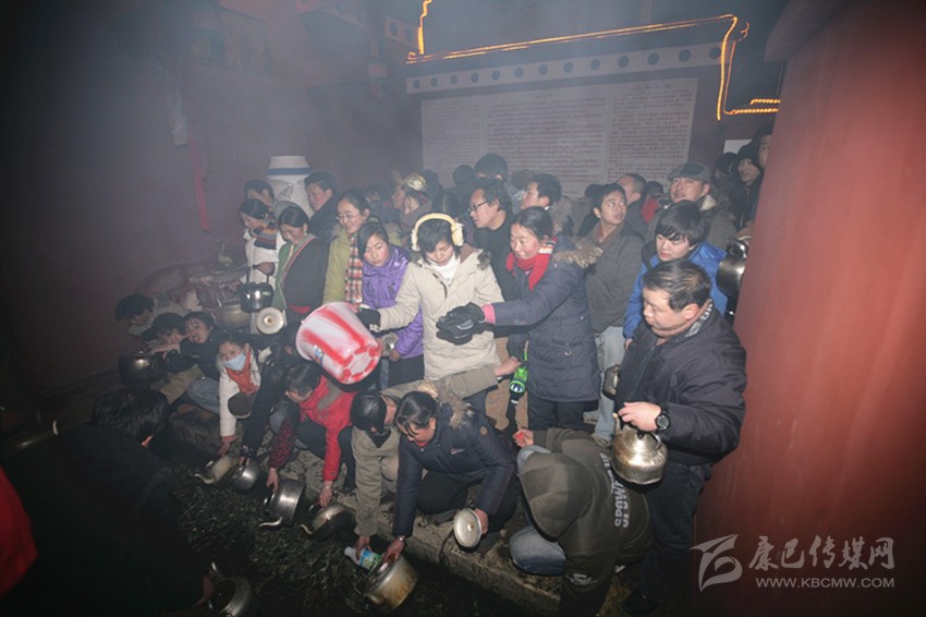“每年大年三十我都會(huì)在這里來搶頭水,傳說郭達(dá)山神和跑馬山仙女會(huì)化身為一對(duì)金鴨在里面戲水。老人們說大年三十到正月初一‘翻年’那個(gè)節(jié)點(diǎn)來取水,就能看見金鴨,而水也等同于仙液。”在剛剛年滿40歲的陳先生兒時(shí)的記憶中,這里每到春節(jié)“就會(huì)有人提著水桶,拿起茶壺排起長(zhǎng)龍來看金鴨,搶頭水。”