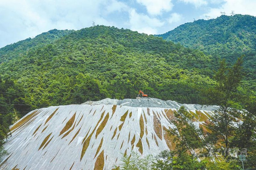 大柏牛棄渣場(chǎng)坡頂、坡面撒的草籽已冒芽,棄渣場(chǎng)看起來(lái)綠油油的一片;海子溝棄渣場(chǎng)表面蓋著防止渣土滑落的油布,底部砌起了一堵厚厚的擋墻,為河道讓出空間……