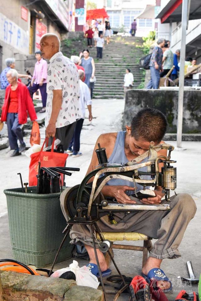 8月15日,南部縣長坪鎮(zhèn)文化街,正在補鞋的周強(qiáng)善。攝影 張可凡