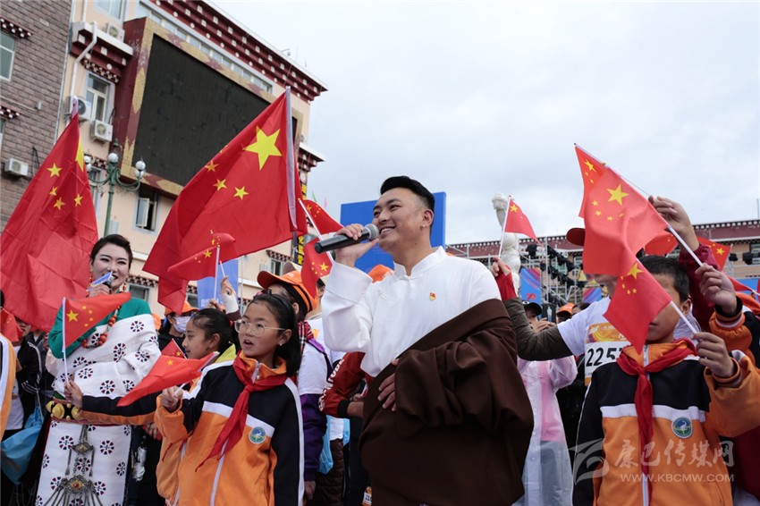 在開幕式上,藏族男女飽含真情領(lǐng)唱《歌唱祖國》,緊接著,托舉五星紅旗的儀仗隊緩緩進場。當雄壯的《義勇軍進行曲》響起,跑者、老師、學生、干部、農(nóng)牧民群眾等向冉冉升起的國旗行注目禮,心里升騰起無比的自豪。