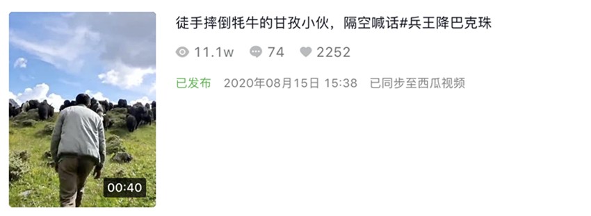 8月3日,這段僅有10秒長(zhǎng)的視頻,在抖音短視頻平臺(tái)《甘孜日?qǐng)?bào)》康巴傳媒抖音號(hào)發(fā)布后,短短一天內(nèi)獲得了800多萬次播放量,200多名網(wǎng)友留言評(píng)論,18萬次點(diǎn)贊更是“宣告”其正式成為“網(wǎng)絡(luò)爆款”。