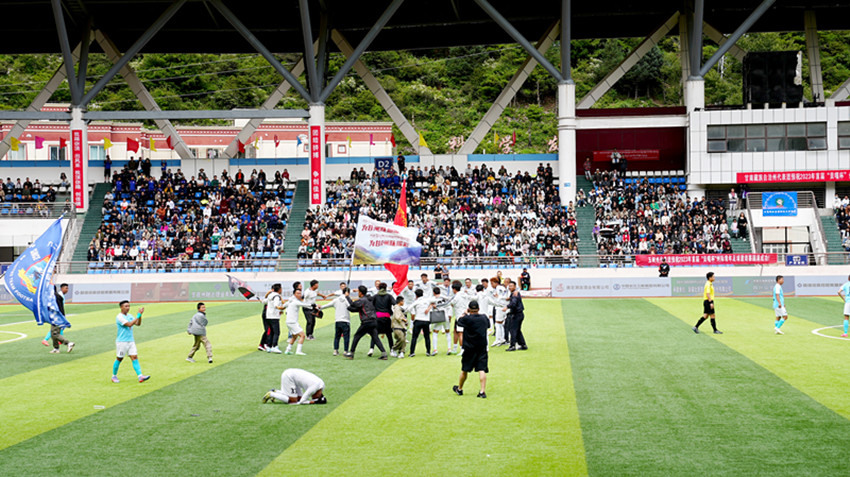 比賽進入下半場,雙方一上場便持續(xù)強勁攻勢,比賽至第52分鐘時,甘肅甘南隊成功避開四川阿壩隊再次射門進球又得一分,在全場喝彩聲中,甘肅甘南隊全體隊員士氣高漲,乘勝追擊。比賽至65分鐘,甘南隊再進一球,比分擴大至3:0。此時四川阿壩隊迅速調(diào)整狀態(tài)和戰(zhàn)術(shù),發(fā)起強勢進攻,在比賽進行至93分鐘時,憑借一個任意球破門得分。比賽得分最終鎖定在3:1,甘肅甘南隊贏得比賽勝利。