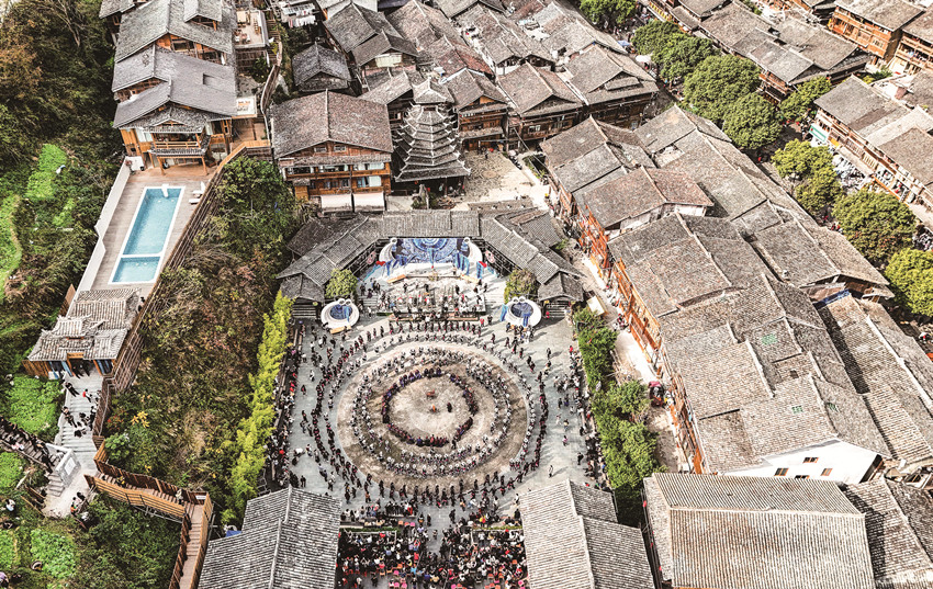 在貴州省黎平縣肇興侗寨,侗族群眾身著節(jié)日盛裝參加侗年踩歌堂活動。