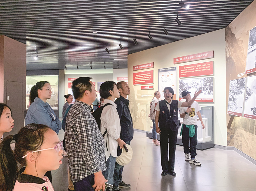 “國(guó)慶節(jié)的心情若有顏色,一定是紅色。瀘定作為一座紅色之城,擁有數(shù)不勝數(shù)的珍貴‘紅色寶藏’,這里有無(wú)數(shù)的紅色故事可以講述,也有光榮的革命精神在悠久傳承?!闭跒o定橋東橋頭排隊(duì)檢票的重慶游客李先生表示,他們一家?guī)е谏闲W(xué)六年級(jí)的兒子利用“雙節(jié)”假期,到瀘定體驗(yàn)“紅色文化研學(xué)”線路,從書(shū)本到現(xiàn)實(shí),走上瀘定橋接受紅色教育,感受長(zhǎng)征精神。