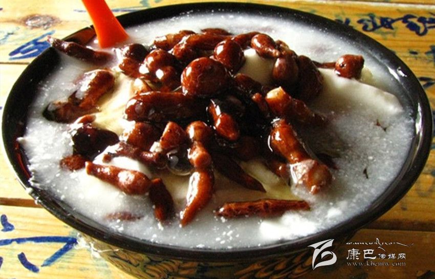 人參果飯也叫“卓瑪折絲”。將人參果煮熟后,放在米飯上面,細細地撒些白糖,再均勻地淋上一勺滾燙的酥油汁,一份營養(yǎng)又好吃的人參果飯就做好了。人參果飯被藏族同胞視為一種吉祥的食物,只在婚禮、節(jié)日食之,以之待客,視為尊貴之意。在隆重的藏歷新年,人參果飯會被盛在一個小巧精致的盛器內,供于佛龕前。