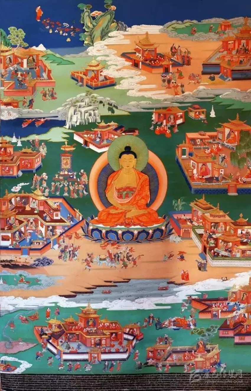 這套《如意寶藤》唐卡畫是在十七世紀,東谷寺第六世活佛降巴更登嘉措命畫師郎卡杰繪制而成。傳說在十七世紀,在今爐霍縣境內(nèi)的一個地方,有戶農(nóng)民家生了一名聰明伶俐的小男孩,因其家境貧困從小就當童工,為別人放牧維持生活,其乳名為孜珠(牧童)。孜珠非常喜歡繪畫,平常利用放牧的空閑學(xué)畫,沒有紙張筆墨,晴天里他把地當紙,用小棍做筆, 陰天用石板作紙,小石子作筆每天堅持學(xué)習(xí)繪畫。他在極其艱苦的環(huán)境中,勤學(xué)好問,刻苦鉆研繪畫知識及其基本技巧。他刻苦學(xué)畫的恒心和誠意,感動了神仙畫師毗首羯摩。在一個良辰吉日神仙畫師來到人間收孜珠為徒,把自己的所有知識傳授于他。