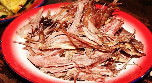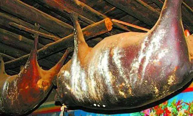 康南則用繩將豬勒死,讓血存于體內(nèi),然后用草點(diǎn)火去毛,于肛門(mén)處割一孔,取出內(nèi)臟,用干草或麥子等塞入豬腹內(nèi),用針縫合,縫口處用灶灰摻水?dāng)嚭铣珊芊?,掛在室?nèi),待其發(fā)酵,產(chǎn)生臭味時(shí)食用,稱“臭豬肉”。