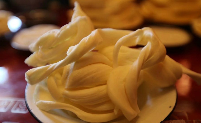 酥油古稱醍醐,元代才開始叫酥油。元代宮廷食醫(yī)思慧在《飲膳正要》中記述了酥油的提取方法:“取凈奶子,不住手用阿赤打,取浮油者為思馬哥油,今亦云曰酥油。”文中“阿赤”是提取酥油的木器。提取酥油有專門的酥油桶,桶里有一個(gè)連桿木柄,倒上牛奶,蓋上桶蓋后,連續(xù)上下抽動(dòng)連桿木柄數(shù)百上千次,黃澄澄的酥油塊就全部浮在上面了。把酥油塊用手捏成坨,擠去水份,丟進(jìn)清水里泡一會(huì)兒,就可以食用了?,F(xiàn)在牧區(qū)打酥油普遍用奶油分離器,既快又省。