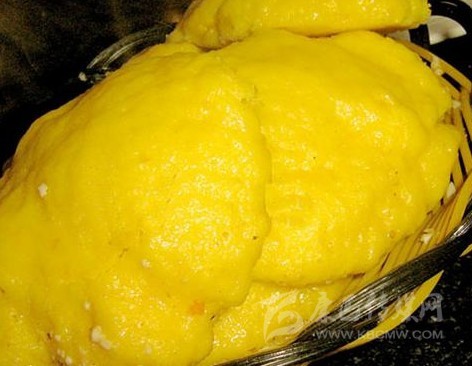 玉米饃是爐城平常人家常食的,就是許多做小生意開小攤鋪,常蒸食玉米饃。雅安人彭大春夫婦,早年曾在康定幫人干活,夫婦善做小吃。爐城大米昂貴,知爐城愛吃玉米,又愛吃“焦粑”(一種以面粉起酥肉餡炕餅的小吃)習(xí)慣,用金鉤鮮肉做餡,仿效“焦粑”的做法,用上等玉米面,創(chuàng)造出玉米面包金鉤炕餅,以其香、咸酥、脆味長誘人,食者排隊(duì)購買,風(fēng)行一時(shí)。