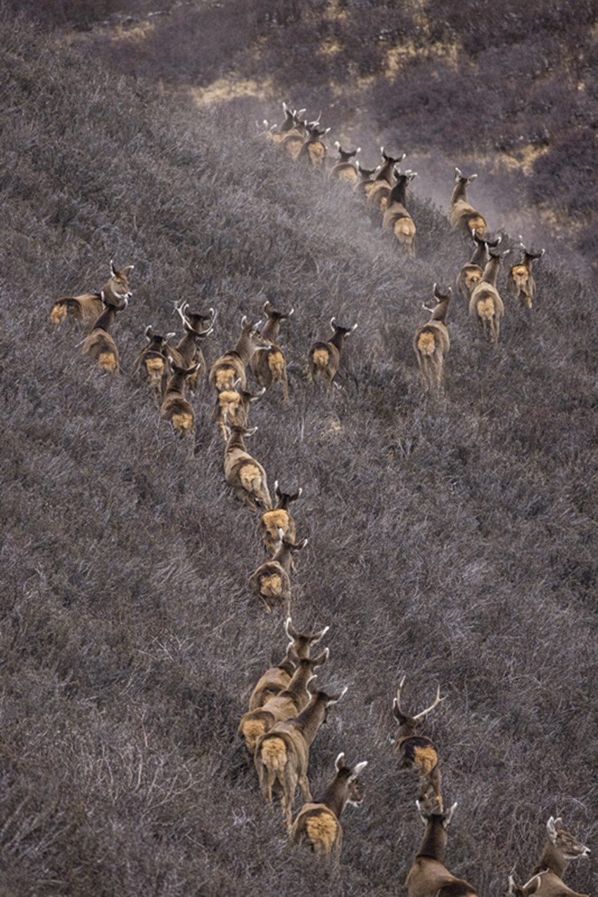 白唇鹿整齊行進(jìn)遷徙。