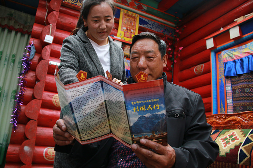 德格縣更慶鎮(zhèn)村民學(xué)習(xí)民族團(tuán)結(jié)進(jìn)步村規(guī)民約。