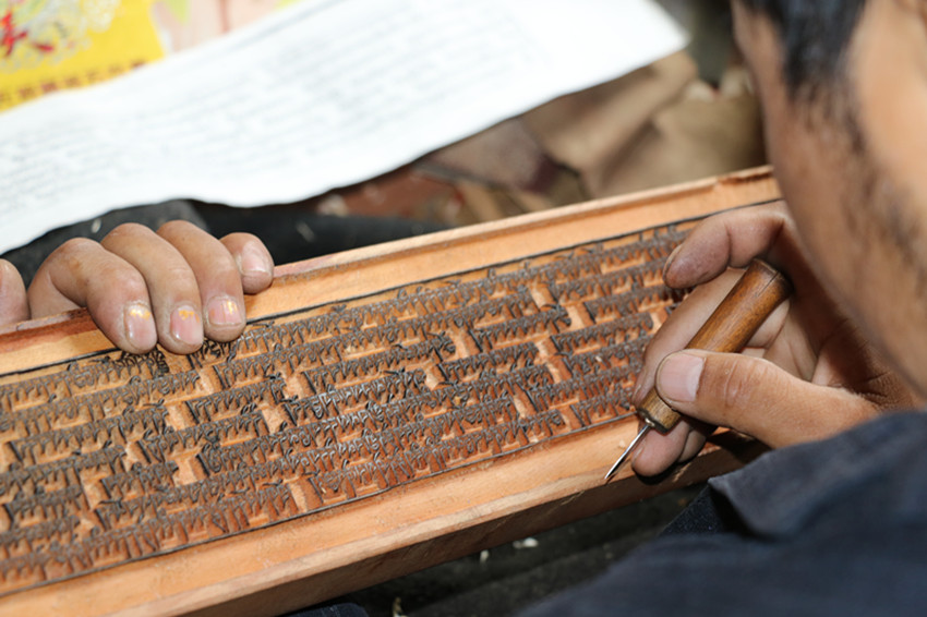 彭措澤仁現(xiàn)在的主要工作是核對(duì)、修復(fù),幾千塊有破損、錯(cuò)字或被老鼠咬壞的印版,經(jīng)他手得以復(fù)原。每完成一塊,彭措澤仁都會(huì)雙手將印版高舉過(guò)頭,閉目許愿。這是“敬畏之心”。